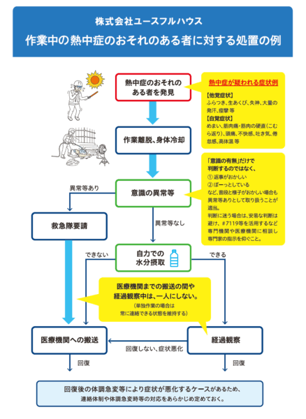 まずは熱中症の恐れのある職人の方を把握した場合に迅速かつ的確な判断が可能となるようにフロー図を作製し現場に掲示しています。